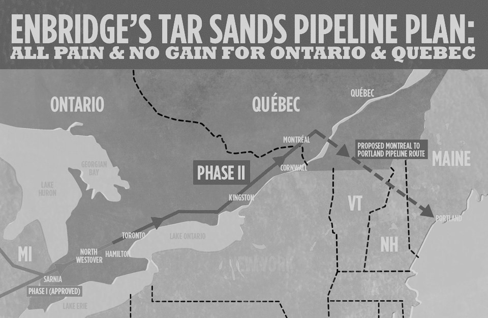 The reversal of Enbridge Line 9 was approved by the National Energy Board on Thursday. The 40 year-old pipeline is the first to deliver diluted bitumen from the Alberta tar sands en masse to Ontario and Quebec. Line 9 has been the focus of climate activism in Toronto for the past two years. Image courtesy of Environmental Defence.